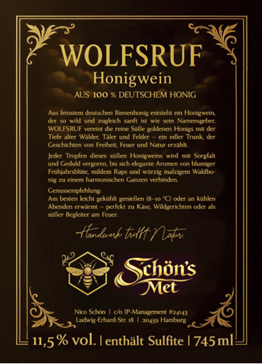 Aus feinstem deutschen Bienenhonig entsteht ein Honigwein, der so wild und zugleich sanft ist wie sein Namensgeber. WOLFSRUF vereint die reine Süße goldenen Honigs mit der Tiefe alter Wälder, Täler und Felder – ein edler Trunk, der Geschichten von Freiheit, Feuer und Natur erzählt.